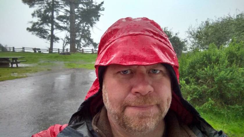 Dave enjoying the rain while breaking camp.
