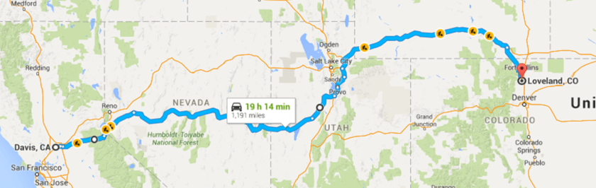 Route from Davis, CA to Loveland, CO.