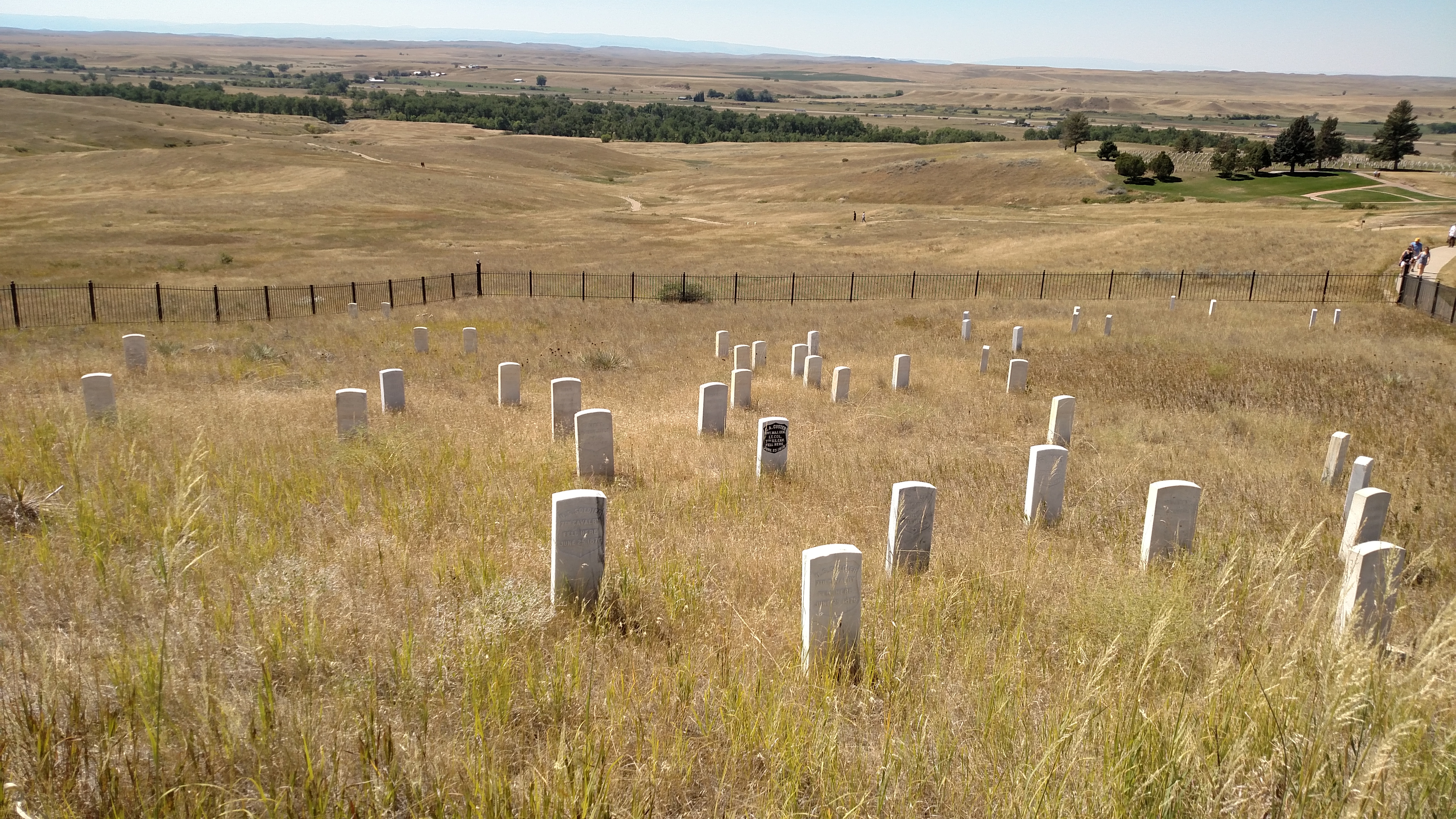 Previous Image Next Image IMG_20160821_122734679 Markers indicating where US Calvary members fell. The black marker is George Custer’s. Three other Custer family members died in that battle, as well.