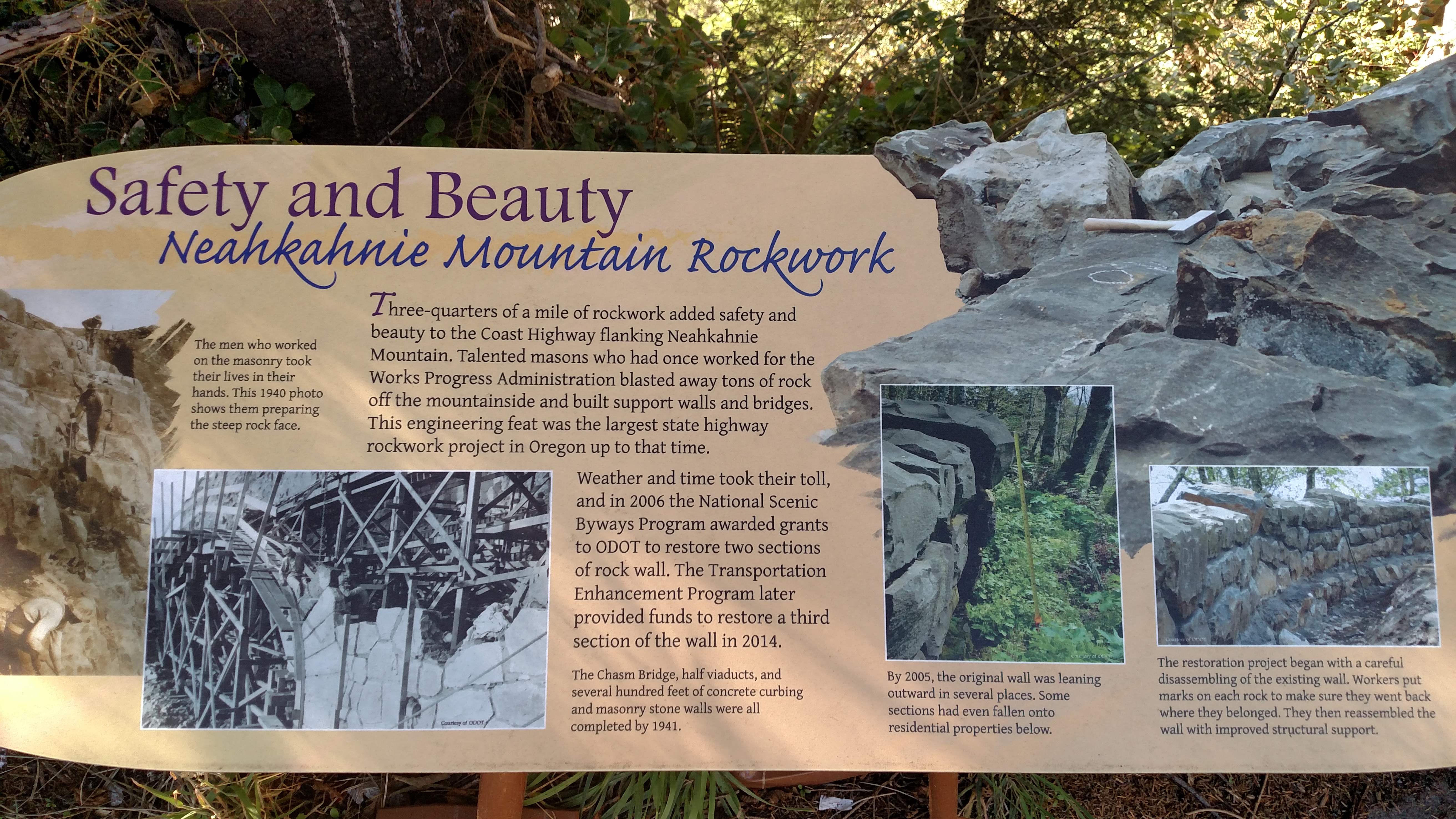 Neahkahnie Mountain roadwork information plaque.