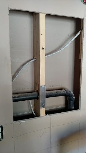 Previous Image Next Image mb_07 The vent pipe that forced the medicine cabinets to become surface mounted. And more mudding and taping of drywall.