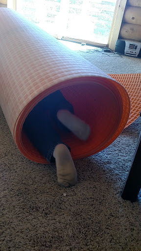 Alex helping Dave by crawling through a Ditra tunnel.