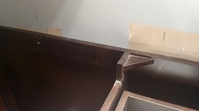 Previous Image MB_12 How to properly secure a vanity. Pencil marks the wall stud. Pre-drill the vanity to prevent splitting the wood. Anchor to wall studs.