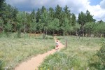 The DeLonde trail is rather easy trail. Narrow in some spots, but not excessively rocky and minimal tree roots. It passes through stands of Ponderosa pines and Aspen. About half of the DeLonde trail is on the old Switzerland (ran from Boulder to Ward) narrow gauge railway line and was quite wide and smooth. A pretty easy hike to the DeLonde homestead.