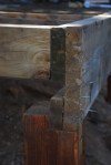 So this band board joint is backed by a post. The post is sitting haphazardly on a rock. And there is a bolt going through the joint.
