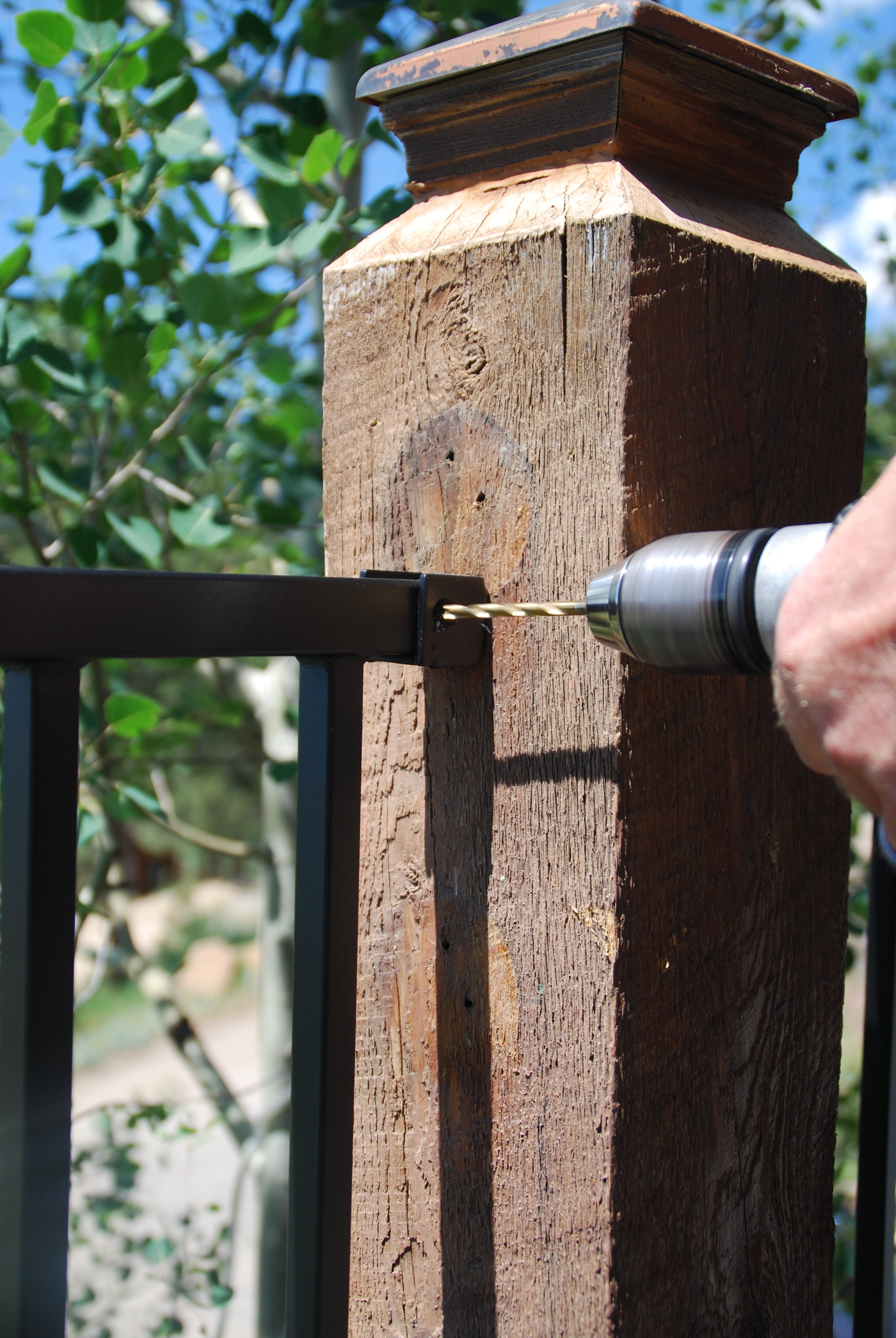 Pre-drilling the railing anchor screws.
