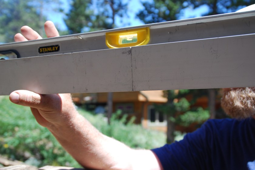 Previous Image Next Image DSC_0122 Aluminum straight edge and level confirming that the sag has been removed from joists.