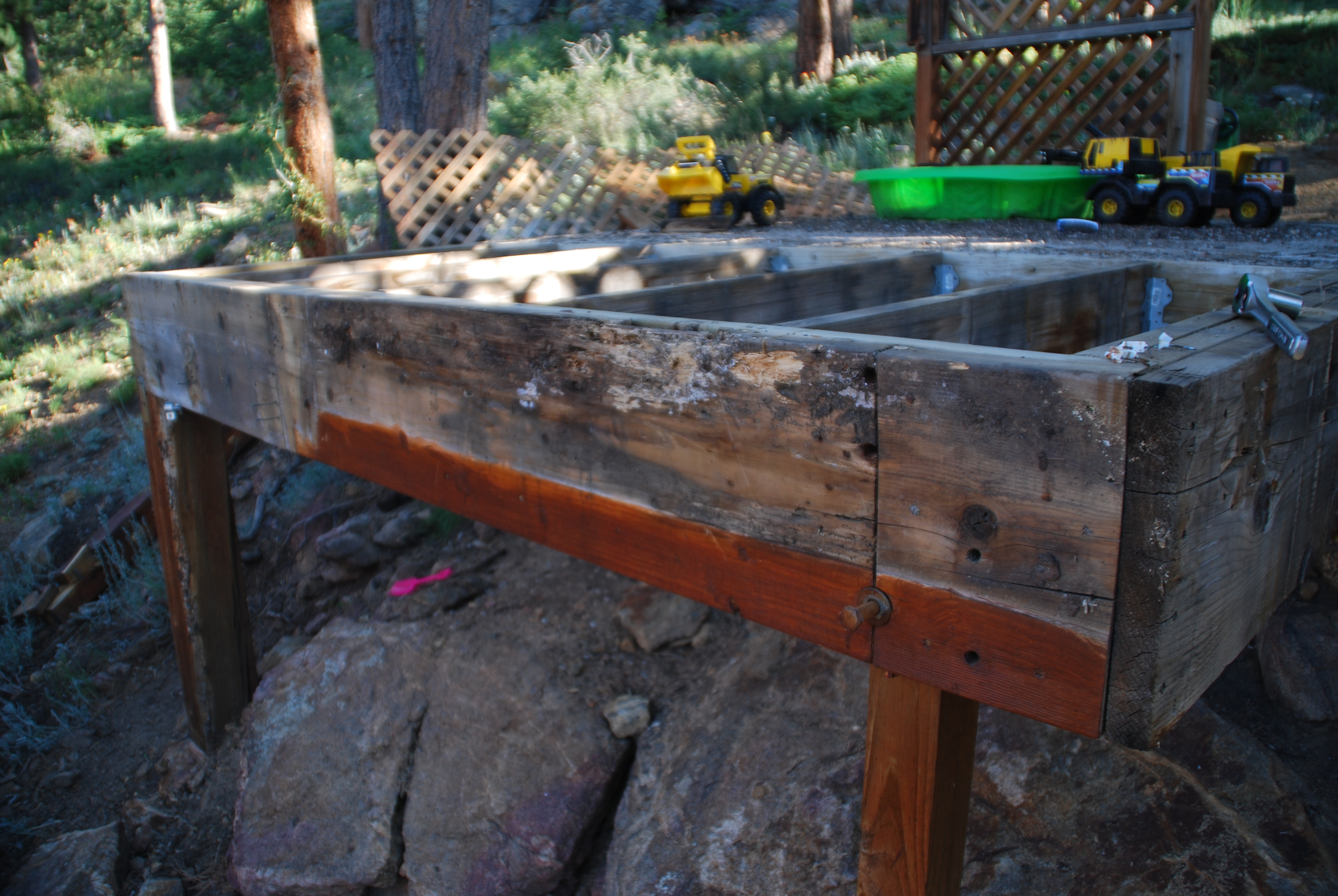 Previous Image Next Image DSC_0239 After the stairs and decking were removed, the framing was available for inspection. Band board starting to rot. How many pieces were used? Three. Not good.
