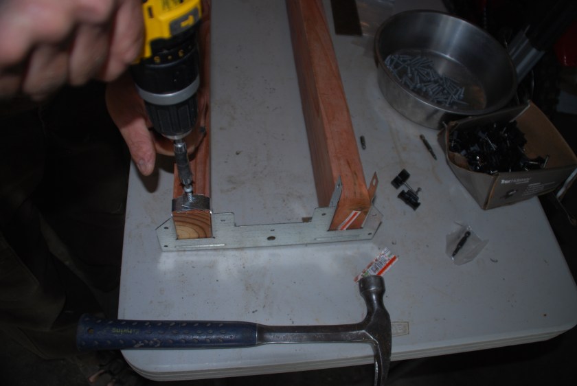 Metal tabs bent over and screwed into the bottom of the 2×4.