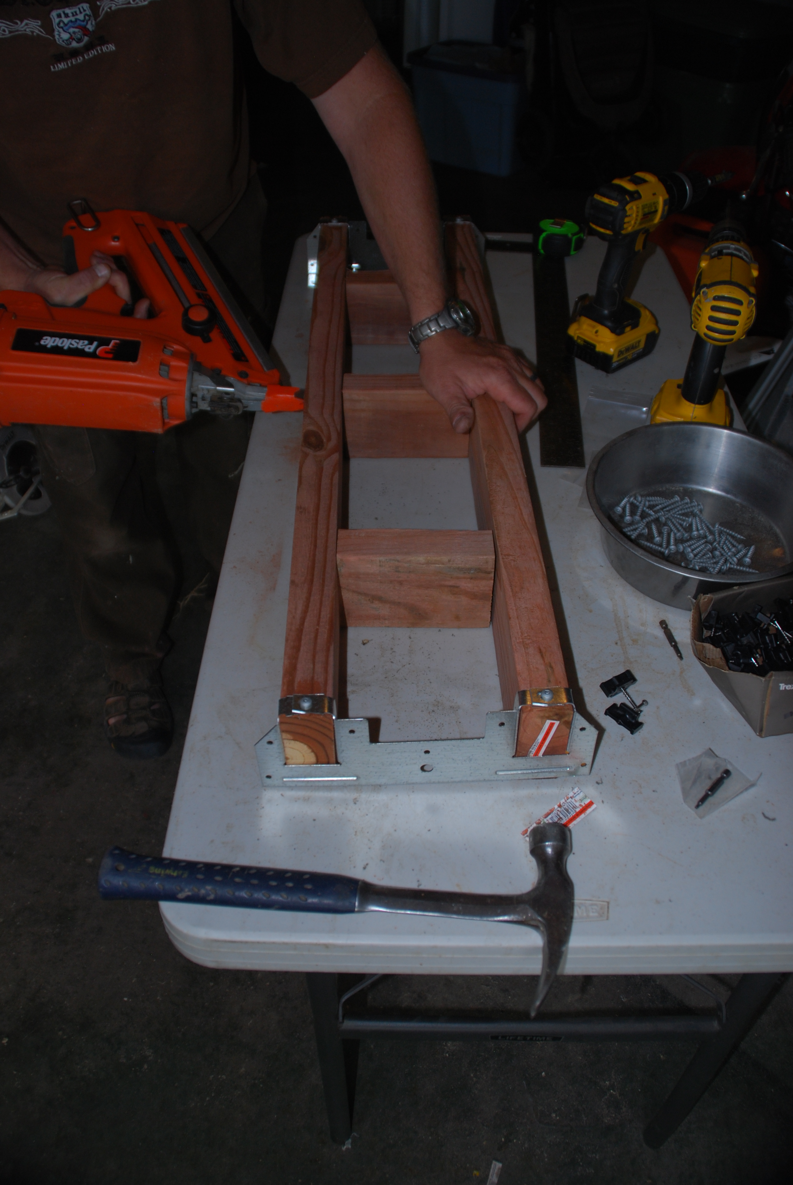 Using a nail gun to secure the cross braces/nailers between the 2x4s.