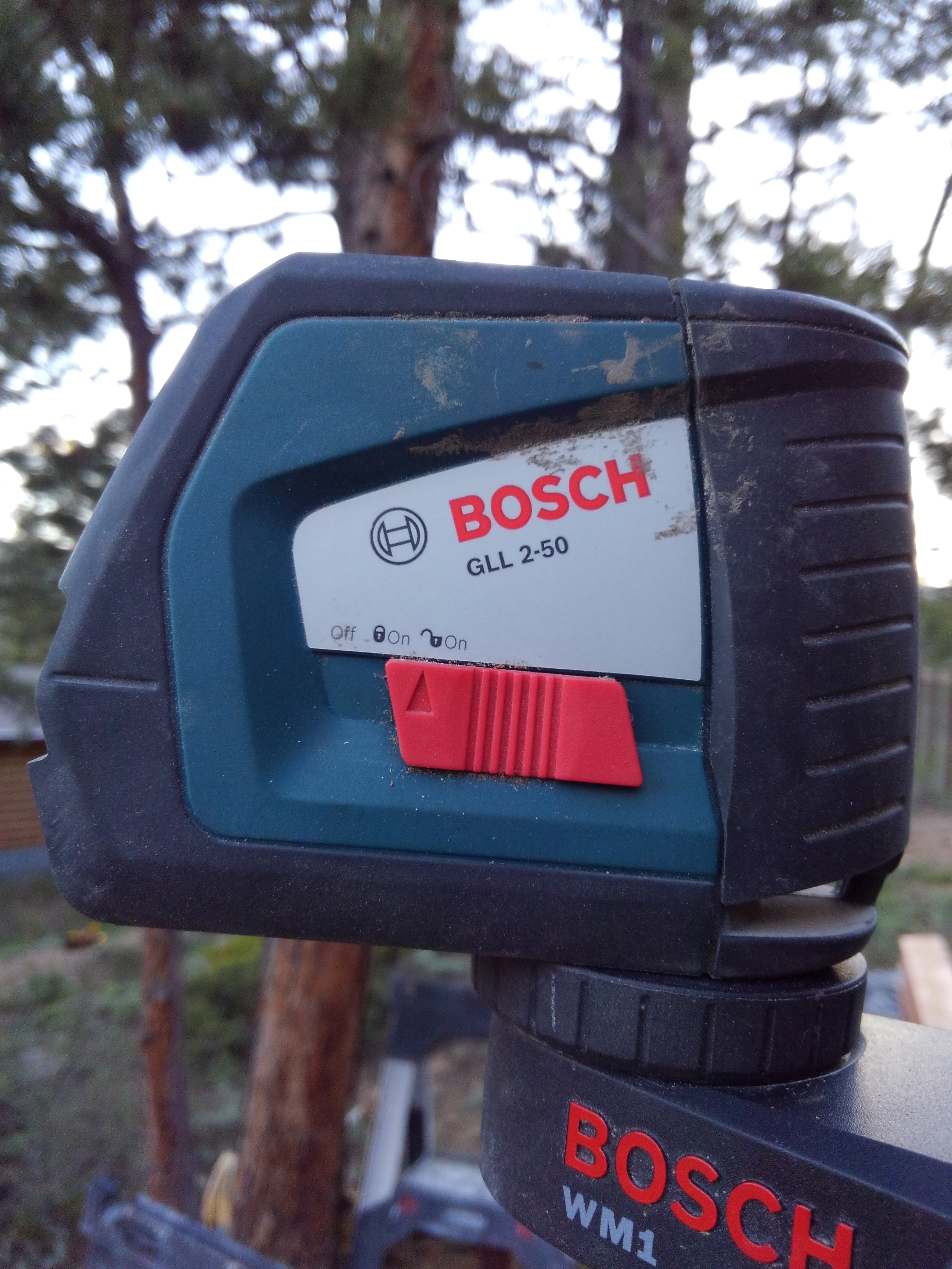 The on but ‘locked’ position “fixes” the level and permits you to draw a diagonal line. Not the proper setting choice for our application. The ‘unlocked’ position allows the laser to free float, so a line at the same level can be determined.