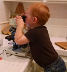A future microbiologist (?) taking a his first look through a microscope.